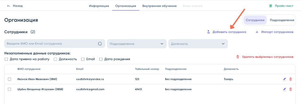 Необходимо нажать на кнопку «Добавить сотрудников» указанную на изображении ниже.