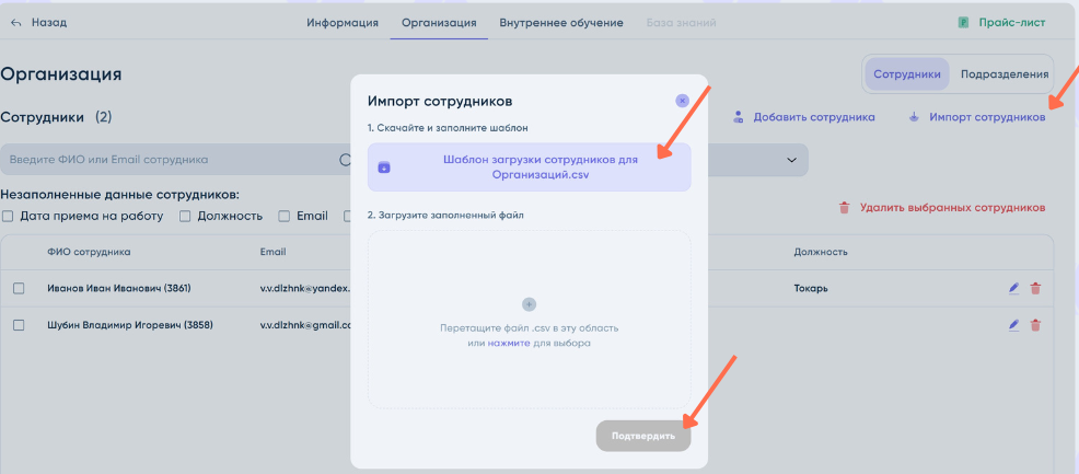 В систему мы можем занести всех сотрудников 1 документом, для этого вам понадобиться нажать на кнопку «Импорт сотрудников», в появившемся окне скачать Excel шаблон для заполнения данных, после чего загрузить его в текущее окно. После загрузки необходимо подтвердить свои действия, и сотрудники появятся в списке.