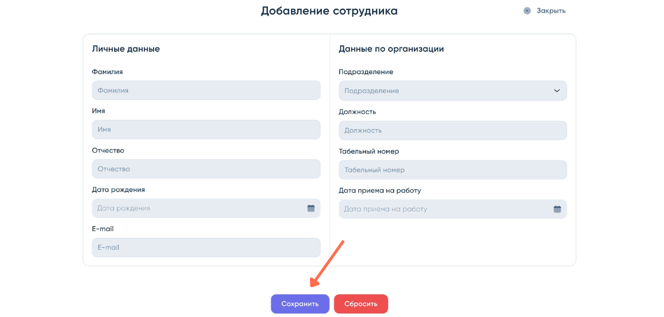 После чего, в появившемся окне нужно заполнить все необходимые поля для внесения сотрудника в систему и нажать кнопку «Сохранить»