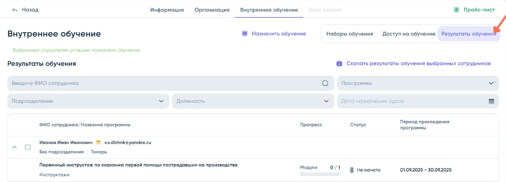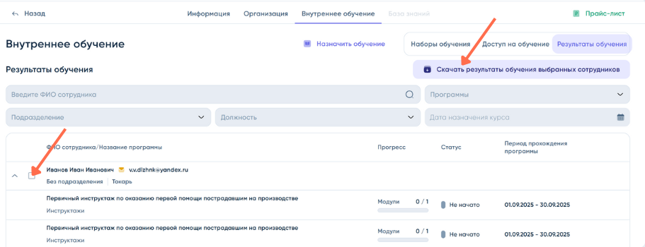 Для этого мы выделяем нужных нам слушателей и нажимаем кнопку «Скачать результаты обучения выбранных сотрудников»